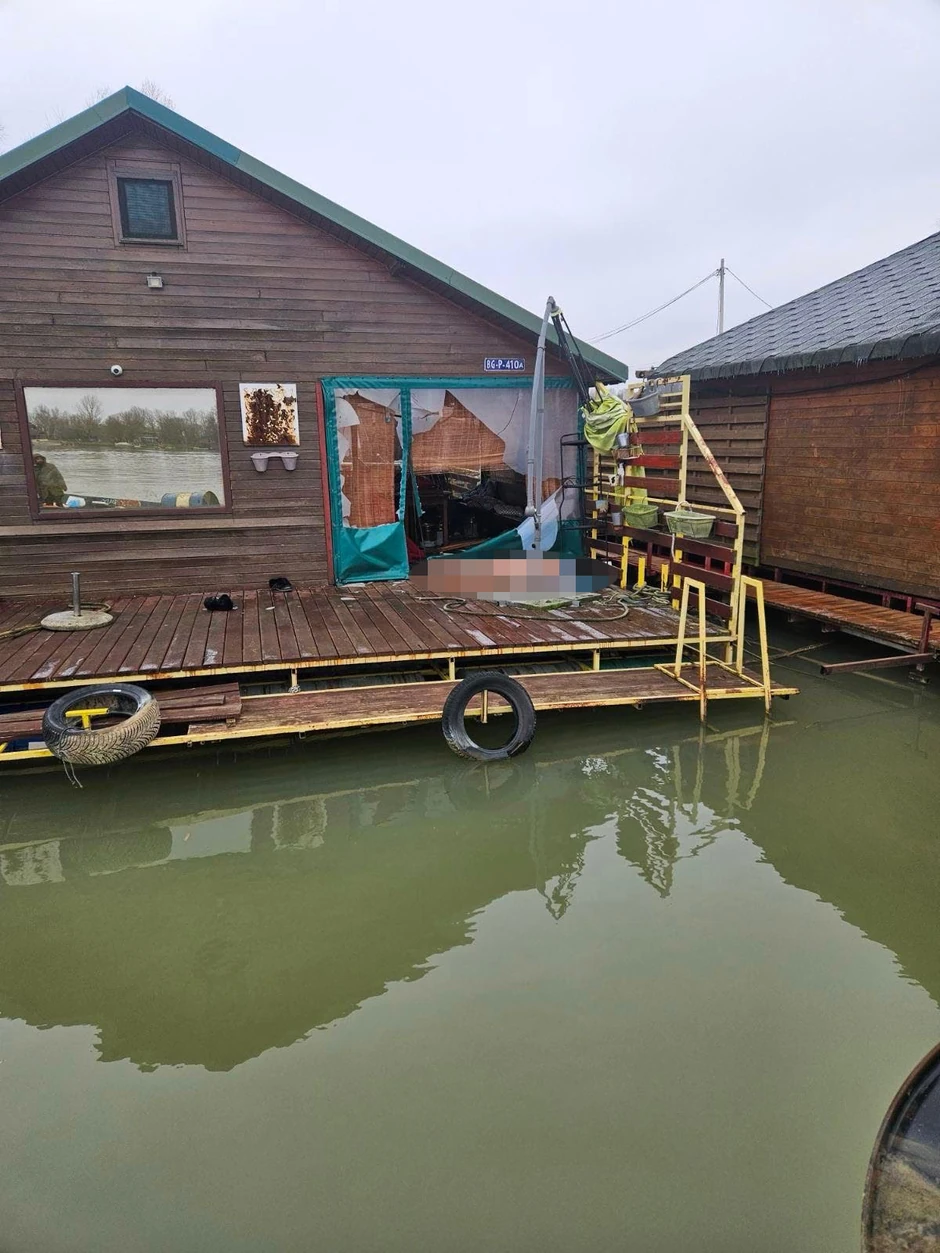 Na prvoj slici sa lica mesta vidi se nago i krvavo telo žene na tremu splava.