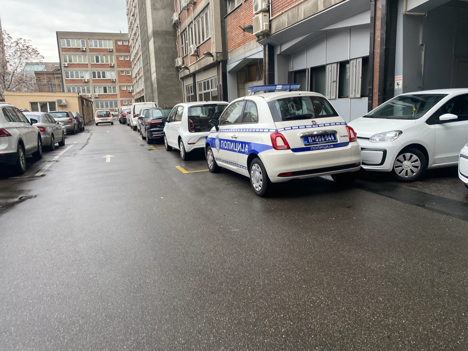 Na parkingu zgrade u Nemanjinoj nalazi se jedno policijsko vozilo, a primetni su i inspektori u civilu.