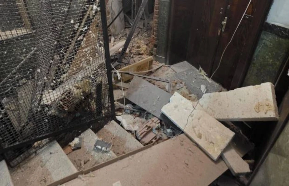 Na fotografijama se vidi srča unutar zgrade. Plafon je otpao, a vrata izbačena iz štoka.
