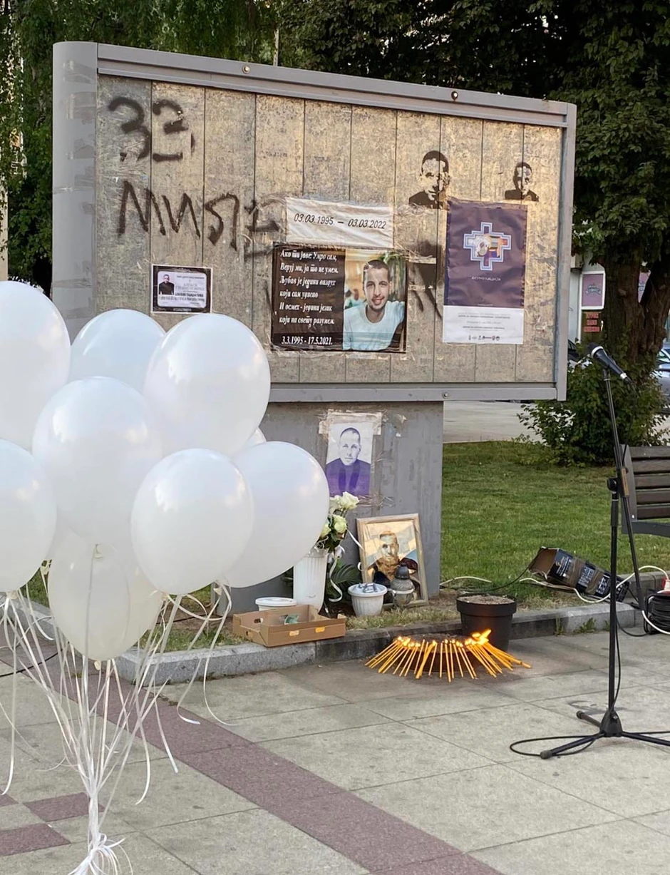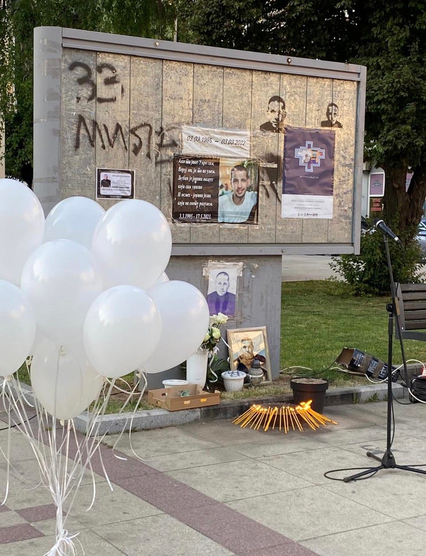 Rođaci i prijatelji nastradalog mladića su zapalili sveće kraj njegove slike na platou ispred Doma kulture a nakon što je govor pročitan, ka nebu su puštena 33 balona...