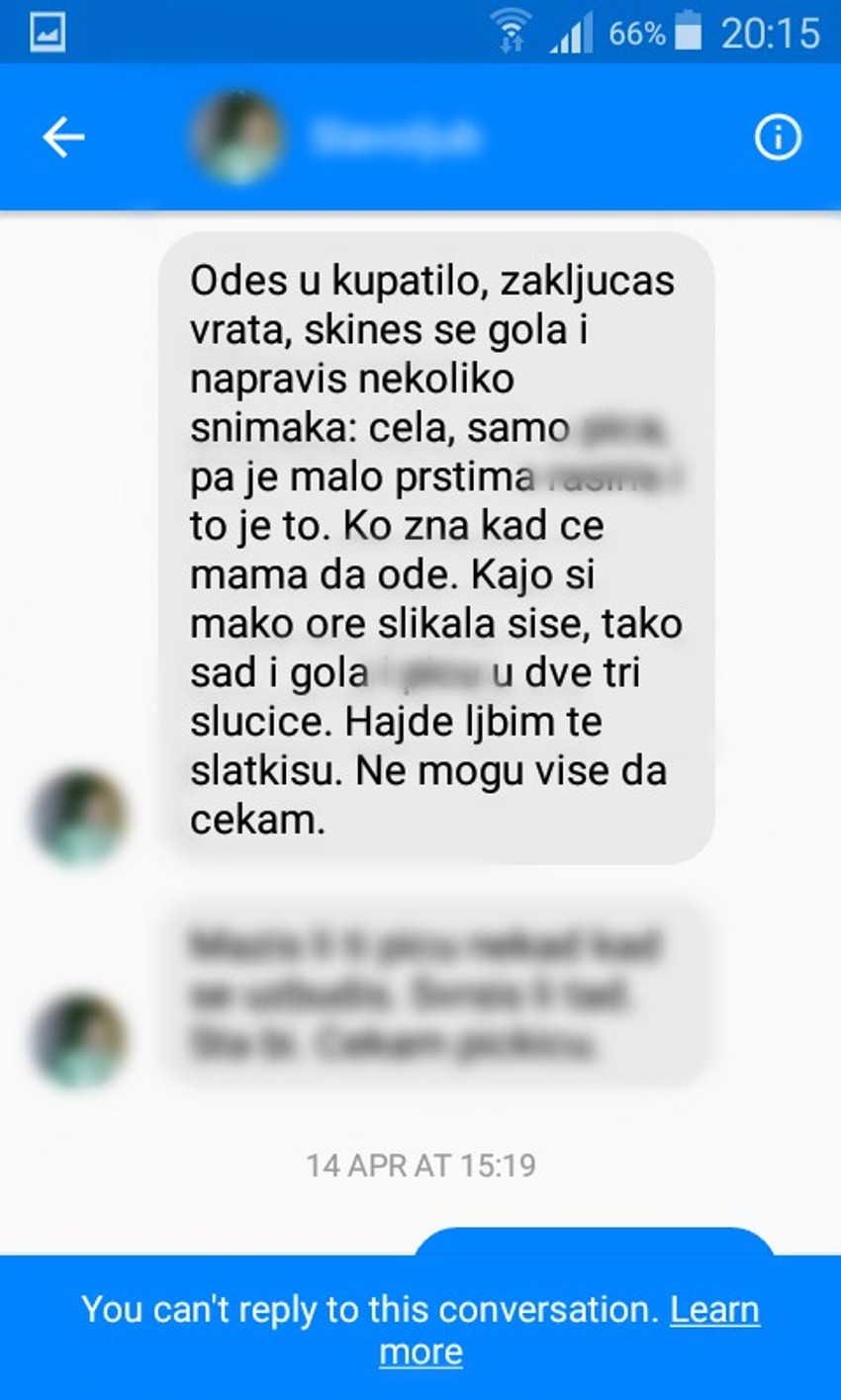 - Nešto su ti grudi nadigle majicu. Jesu li lepe? - glasila je jedna od poruka koju je pedofil iz Zemuna slao devojčici. Na šta mu je ona uzvrtaila porukom da je ni majka to ne pita da bi on nastavio:
