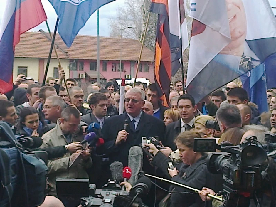 Stotinak pristalica Srpske radikalne stranke, zajedno sa liderom SRS Vojislavom Šešeljem okupilo se na platou ispred Palate pravde gde se danas održava suđenje Nemanji Šaroviću, zameniku predsednika SRS. Šešelj je pred njima zapalio hrvatsku zastavu.