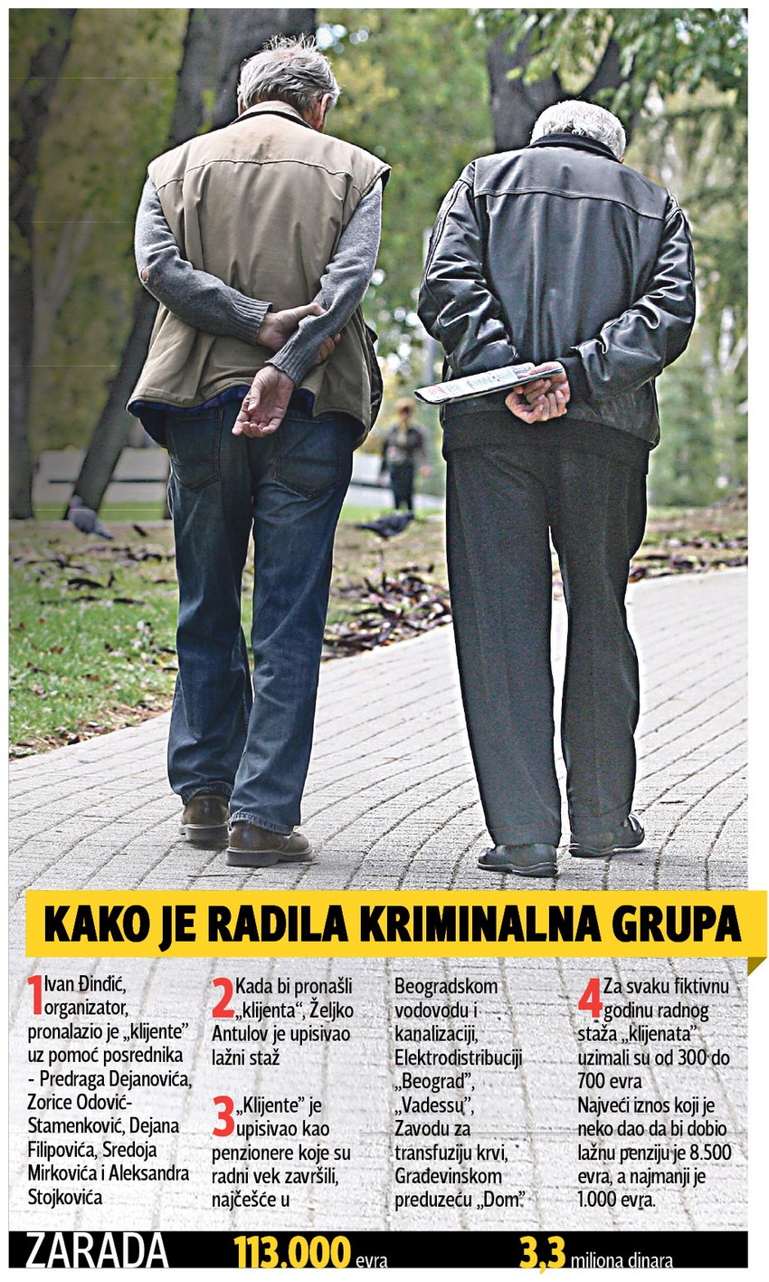 Osim Đinđića, bivšeg radnika Filijale PIO u Beogradu, uhapšen je i njegov nekadašnji kolega referent Fonda Željko Antulov (64). Osumnjičeno je i četvoro posrednika koji su pronalazili osobe kojima je nedostajao radni staž za sticanje penzije: Predrag Dejanović (65), advokat Zorica Odović-Stamenković (60), Dejan Filipović (34) i Sredoje Mirković (67). Za Aleksandrom Stojkovićem, vlasnikom preduzeća „Vadess”, policija traga.