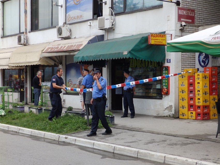 Kako smo saznali od očevidaca koji su sedeli u bašti obližnjeg kafića, crveni „mini moris“ se zaustavio tik uz baštu i dvojica mladića su ušla u prodavnicu.