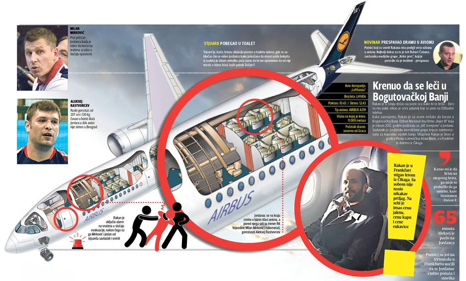 - Svi smo ga primetili odmah po ulasku u avion jer je izgledao kao vehabija. Sedeo je iza nas, ali je odmah nakon poletanja počeo mahnito da se šeta po avionu, da bi se na kraju obrušio na vrata kokpita. Video sam rukometaše kako naglo ustaju i kreću za njim. Zatekao sam ih kako ispred kokpita drže Jordanca i pokušavaju da ga nateraju da sedne - kazao je za „Blic“ Dušan F.
