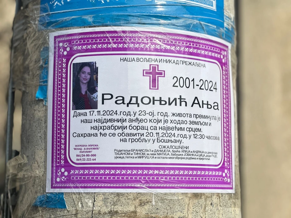 "Naša voljena i nikad prežaljena, Anja Radonjić, 17.novembra 2024. godine u 23. godini života, preminuo je naš najdivniji anđeo koji je hodao zemljom i najhrabriji borac sa najvećim srcem", navodi se na umrlici.