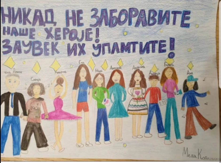 "Crtež Mile Kobiljski (11), mlađe sestre Eme Kobiljski. Danas je 7 meseci od stravičnog događaja u Osnovnoj školi "Vladislav Ribnikar", Duboni i Malom Orašju u kojima je izgubilo život 19 dece i mladih ljudi", navodi se u opisu fotografije na kojoj je objavljen crtež.