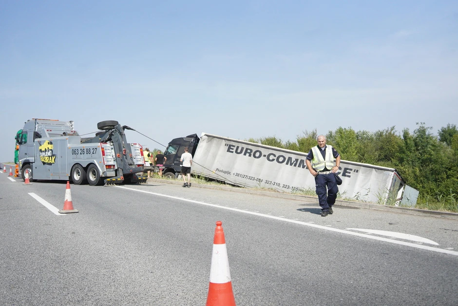 Na autoputu E-70, petlja Pećinci - petlja Sremska Mitrovica šleper je sleteo s puta i saobraćaj je u zastoju.