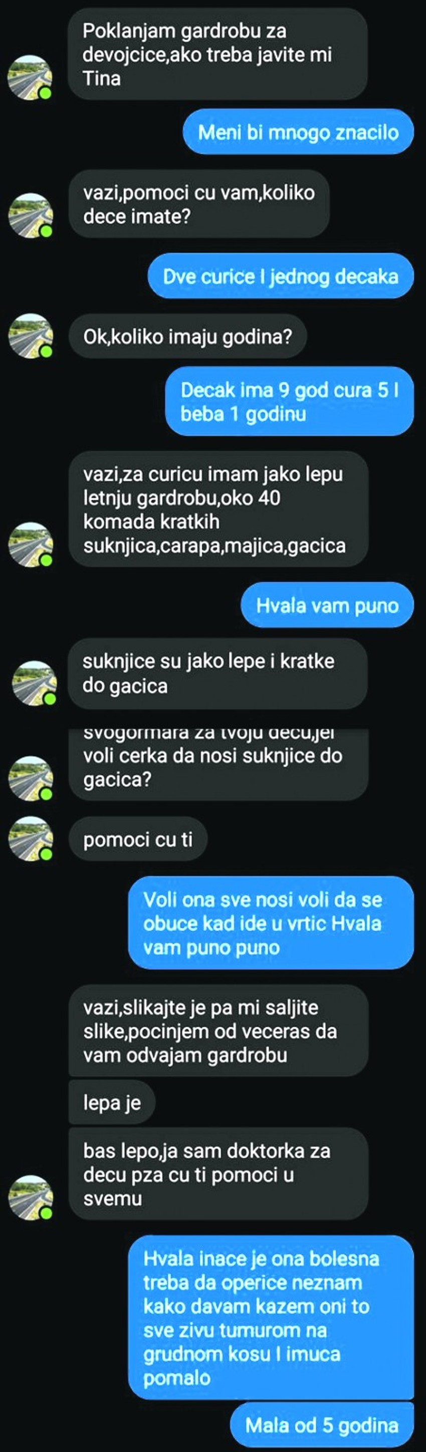 - Ništa nisam posumnjala kad mi je stigla prva poruka da ta osoba poklanja odeću za devojčice i da se javim. Poruku da ima suknjice koje su "kratke do gaćica" shvatila sam tako da misli na suknjice koje imaju ispod ušiven šorts - kaže majka, dodajući da je ubrzo usledio razgovor sa muškarcem tokom kojeg joj je postalo jasno o čemu se radi.