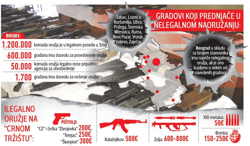 Međutim, ni broj registrovanog oružja u Srbiji nije za pohvalu. Studija koja je rađena u Ženevi došla je do podatka da na 100 stanovnika Srbije ima 38 registrovanih cevi, što je za samo jedan komad manje nego u Iraku. Ispred Srbije su samo stanovnici SAD i Jemena...