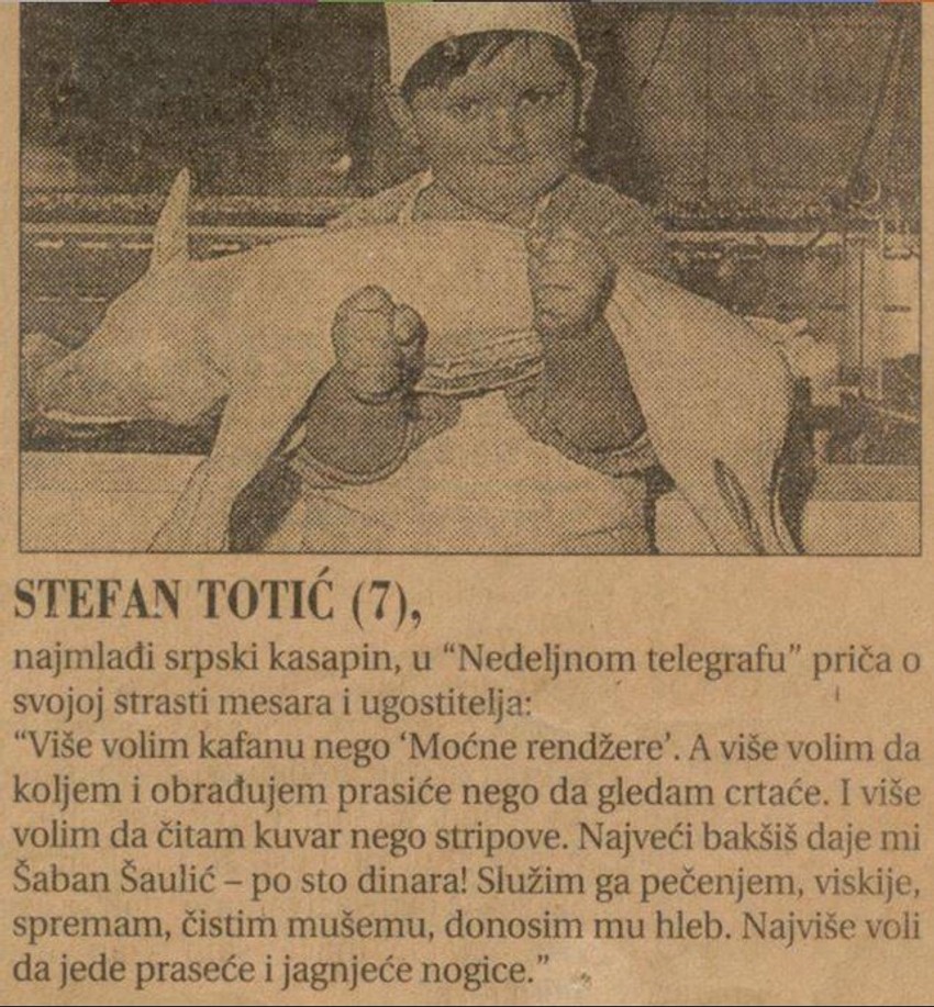Stefan Totić je široj javnosti poznat već više od 20 godina kada je u jednim novinama objavljena njegova slika kao "najmlađeg kasapina" i kratak razgovor u kom je on, između ostalog, rekao da "više voli kafanu nego Moćne rendžere".