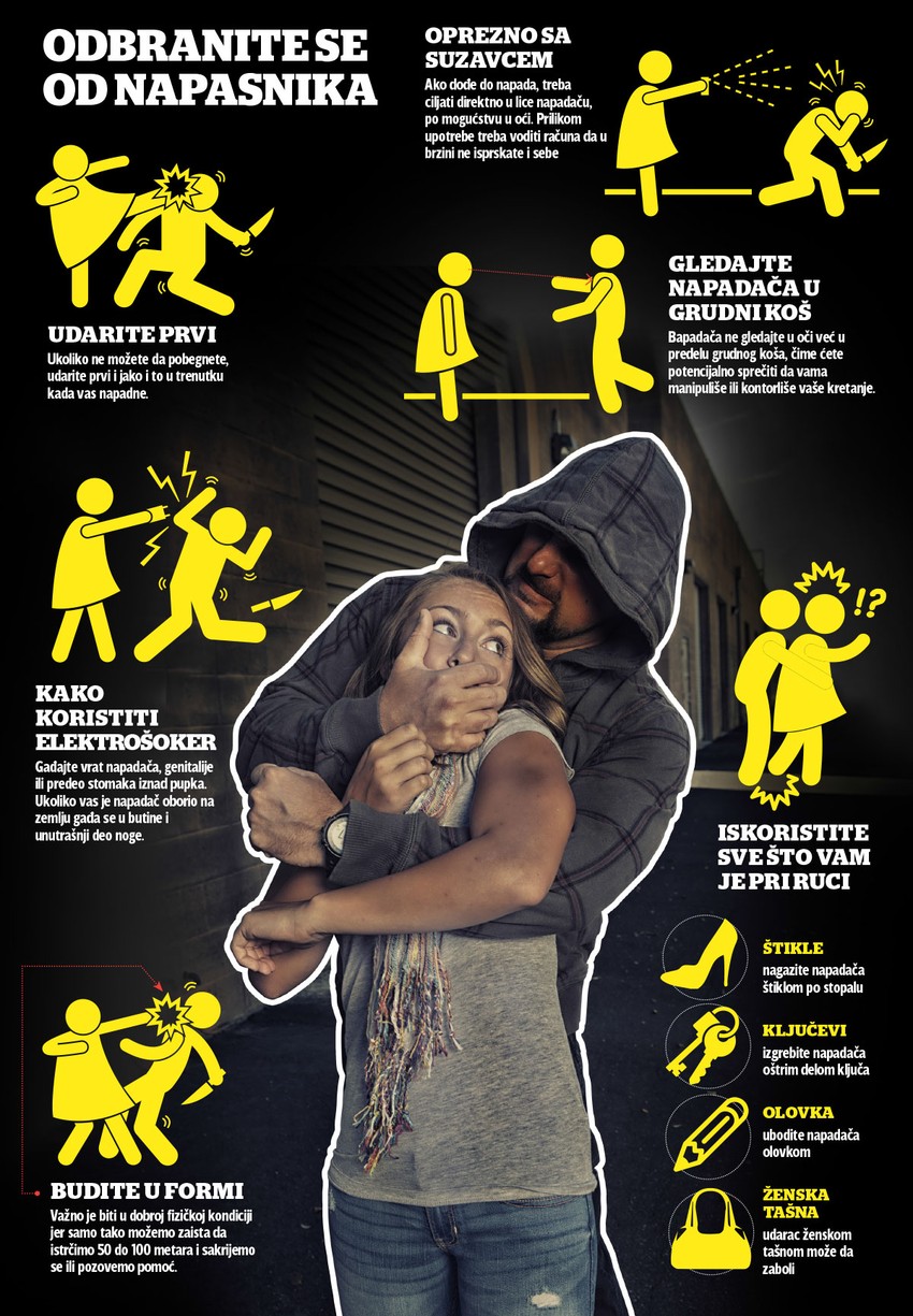 - Ukoliko vas napadač uhvati s leđa, možete da pokušate da ga nagazite štiklom po stopalu. Sve je oružje u takvim situacijama. Sa ključevima od stana možete da ubodete ili da izgrebete napasnika. Turpija, koju većina žena nosi u tašni, može da bude vrlo opasno oružje kojim možete da ubodete, kao i olovka, šnala... Čak i udarac samom ženskom tašnom, ukoliko imate tvrde i teže predmete u njoj, može da bude bolan - objašnjava Anđelka.
