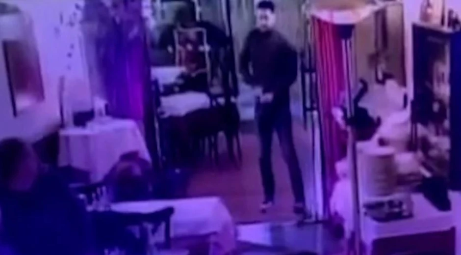 Na snimku se vide i gosti koji su sedeli za stolovima koji su na samom izlazu: dva muškarca koji su se pribili uza zid i muškarac koji hvata devojku za ruku i provlači je iza sebe verovatno kako bi je zaštitio.