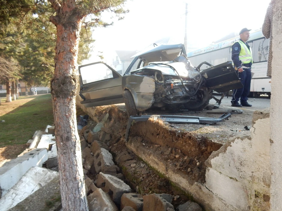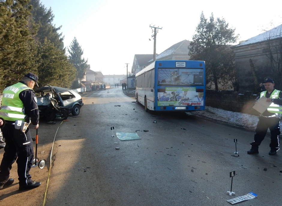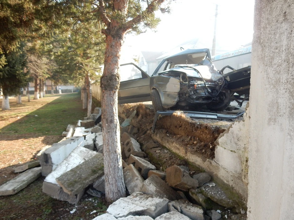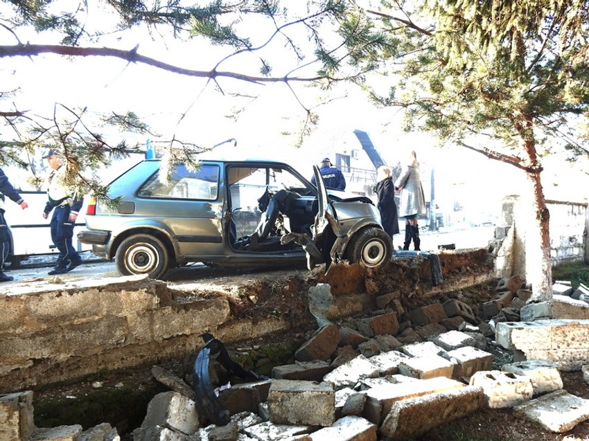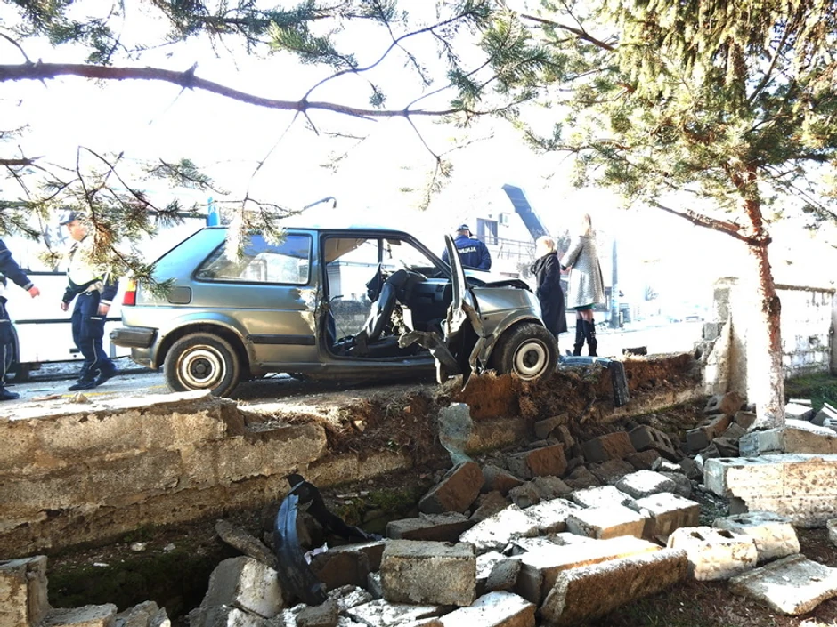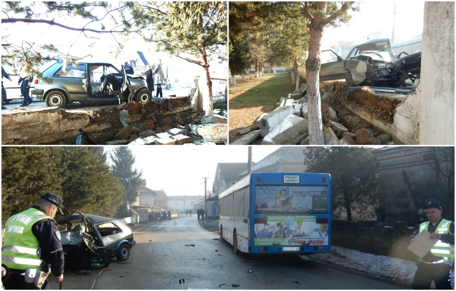Od siline sudara autobus je udario u banderu, a "golf" koji se kretao ka Leskovcu, odleteo je u betonsku školsku ogradu i porušio je.