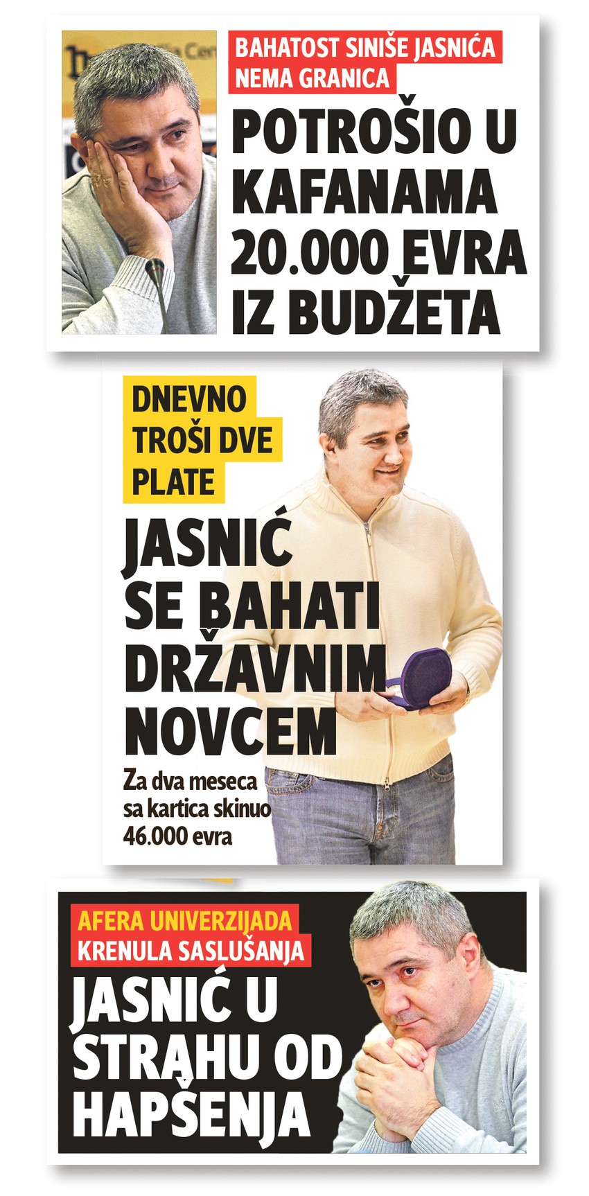 I pored dokumentacije koju smo imali, Jasnić je, umesto dokaza, javnosti ponudio uvrede na račun "Blica". Otišao je čak toliko daleko da je naš list nazvao "najvećim zlom u Srbiji, zbog čijeg pisanja mogu da nam oduzmu Univerzijadu". Igre zbog pisanja "Blica" nisu oduzete, ali njegovim privođenjem jeste oduzeta mogućnost Jasniću da i dalje nekontrolisano troši državni novac.