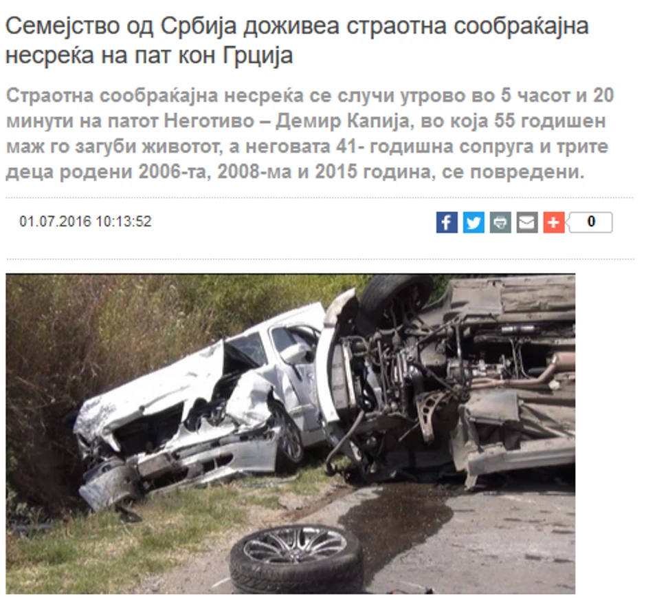 Ljubiša V. (55) iz Beograda je poginuo, a njegova supruga Ivana. V. i troje maloletne dece su povređeni rano jutros kada je automobil sa putnicima iz Srbije udario u orgadu na delu auto puta između Negotina i Demir Kapije.