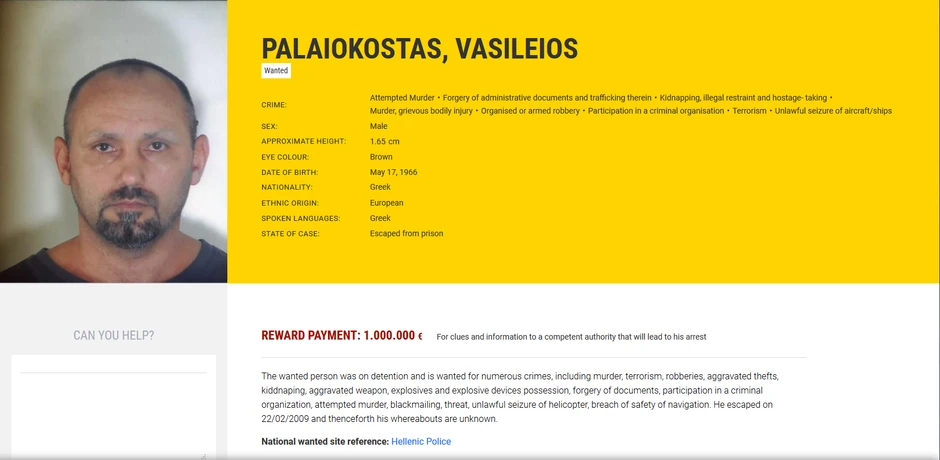 Ako je suditi po sumi koja se nudi, Vasilis Palaiokostas je trenutno najtraženiji evropski kriminalac. Na Europolovom sajtu navodi se da se potražuje zbog niza krivičnih dela, među kojima su teške krađe, kidnapovanje, posedovanje eksplozivnih naprava, falsifikovanje dokumenata, članstvo u kriminalnoj organizaiciji, pokušaj ubistva, pretnje i ucene, ali i nezakonito oduzimanje helikoptera.
