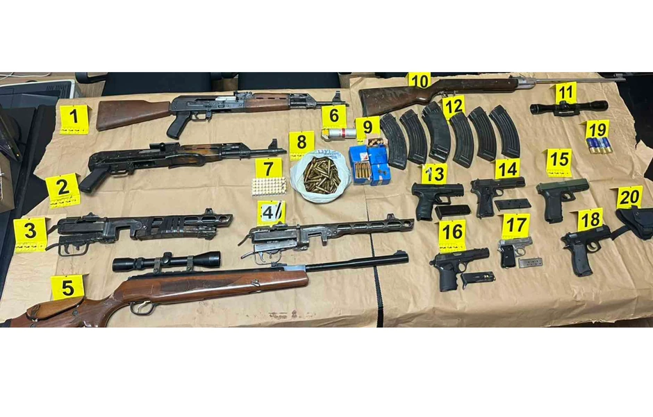 Policija je u pretresu domaćinstva osumnjičenog, pronašla dve automatske puške, dva automata, četiri pištolja, dva gasna pištolja, dve vazdušne puške, 358 komada municije različitog kalibra, sedam okvira za automatsku pušku, jedan optički nišan, jedan suzavac i jednu futrolu za pištolj.
