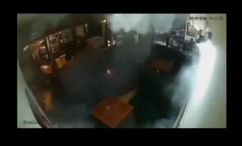 Na novom snimku koji se pojavio, a koji je zabeležen u unutrašnjosti kafića, vidi se kako u bašti nastaje metež, zatim dvojica muškaraca utrčavaju u lokal, bacaju se na pod, a nekoliko sekundi kasnije se vidi bljesak eksplozije.