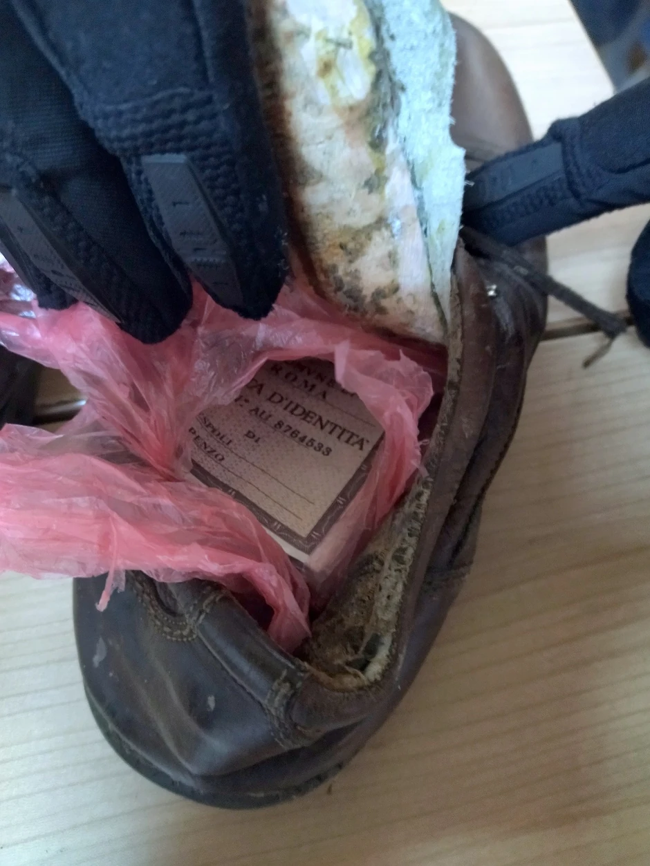 Kako navode iz Uprave carine, usledio lični pretres, a kada su carinici zavirili ispod uložaka njegovih prilično pohabanih cipela, najpre su u jednoj od njih pronašli italijansku ličnu kartu, za koju se proverom ispostavilo da je falsifikovana.