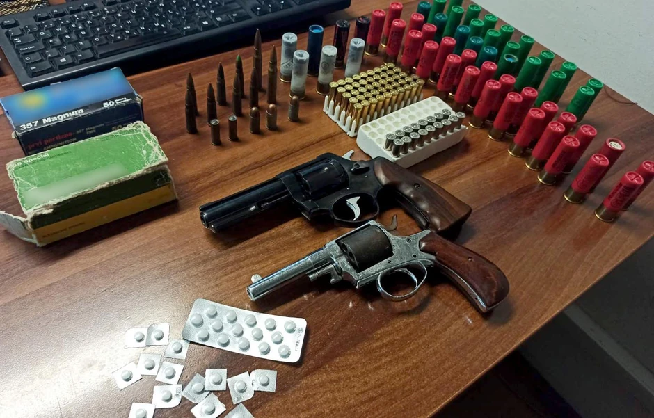 Nakon hapšenja policija je pretresla njegovu kuću i u njoj je pronašla dva pištolja, 130 metkova i tablete sintetičke droge.