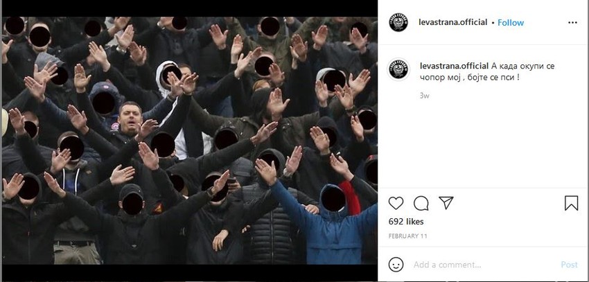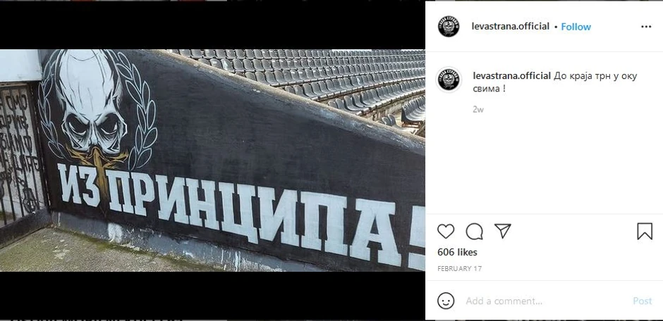 Na jednoj od slika koju su navijači objavili na ovoj stranici nalazi se i mrtvačka glava crno bele boje oko koje je ispisan tekst: "Zaigrajmo tango smrti".