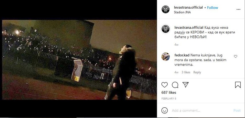 Na ovoj stranici objavljena je i fotografija Velje Nevolje na fudbalskom terenu ispred navijačke tribine uz tekst: "Кad vuka nema raduju se kerovi - kad se vuk vrati bićete u NEVOLJI".