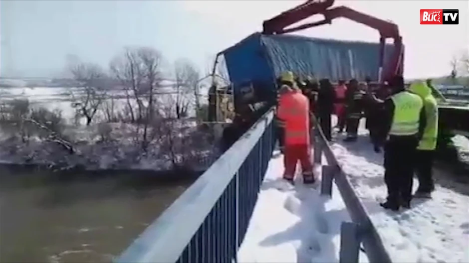 Vozač kamiona koji je probio ogradu mosta kod sela Mijatovac i ostao da visi iznad Morave spasen je posle skoro dva sata.