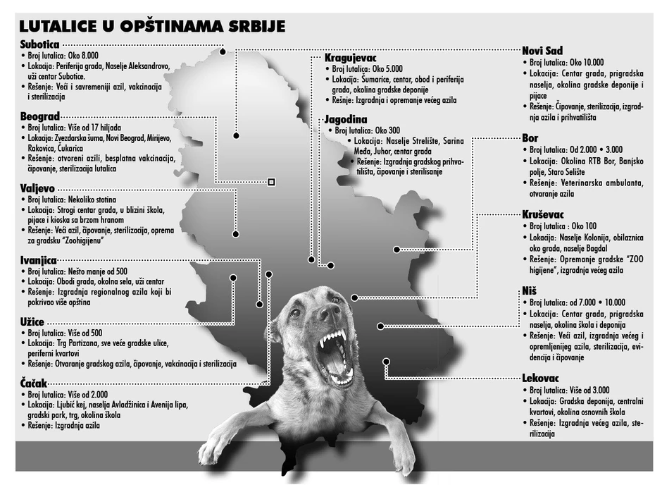 Niš, Novi Sad, Subotica i Kragujevac prednjače po broju lutalica. Ideja za izgradnju azila ima, postoji nekoliko pojedinačnih projekata za čipovanje i sterilizaciju, ali većih pomaka u suzbijanju populacije napuštenih pasa nije bilo. Veliki problem kod većine gradova u Srbiji je i što se uhvaćeni psi vraćaju na ulice, pošto u azilima nema mesta.