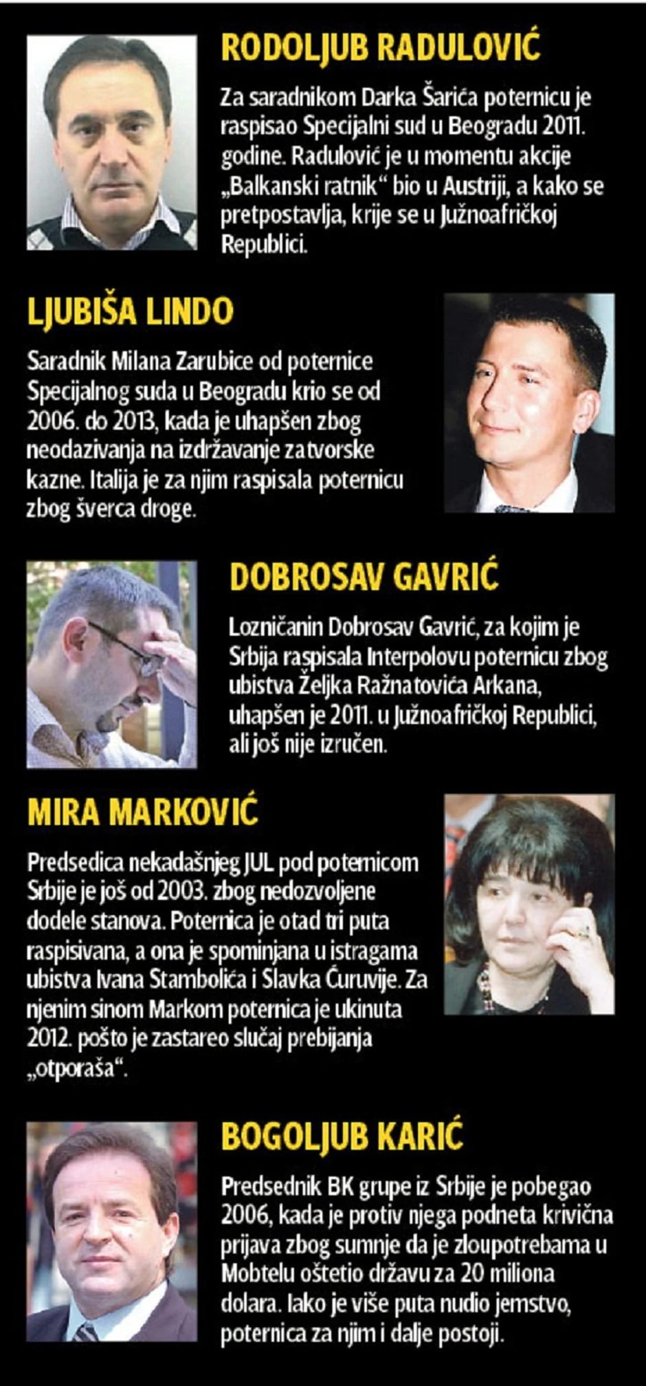 Počuča, bivši portparol PTJ, i Kurak, nekadašnji pripadnik DB, samo su poslednji na listi poznatih Srba. Za Počučom je poternica raspisana zbog neodazivanja na pozive suda na kome se protiv njega vodio postupak za ugrožavanje sigurnosti „Žena u crnom“. Još pre raspisivanja poternice, Počuča je pobegao na ratište u Ukrajinu, gde je nedavno pod misterioznim okolnostima uhapšen, a po eventualnom povratku u Srbiji, čekalo bi ga hapšenja i za novo krivično delo: ratovanje u inostranstvu. I Miroslav Kurak je iz Srbije pobegao pre raspisivanja poternice zbog učešća u ubistvu Slavka Ćuruvije. On se godinama krije u Tanzaniji, gde se bavi profesionalnim lovom na krokodile, bivole, nilske konje...