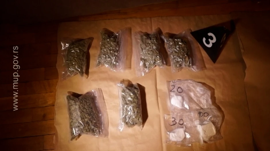 Policija je u automobilu „mercedes“ koji su koristili osumnjičeni J. M. (1996) i K. V. (1999) iza kasetofona pronašla oko 300 grama marihuane, 15 grama MDMA i oko pet grama kokaina, kao i lažnu službenu legitimaciju sa službenom značkom MUP-a. Takođe, prilikom pretresa dva stana koje osumnjičeni koriste, pronađeno je i 10 kilograma marihuane, oko 300 grama kokaina, presa za pakovanje droge, tri elektronske vagice za precizno merenje, kao i veća suma novca.