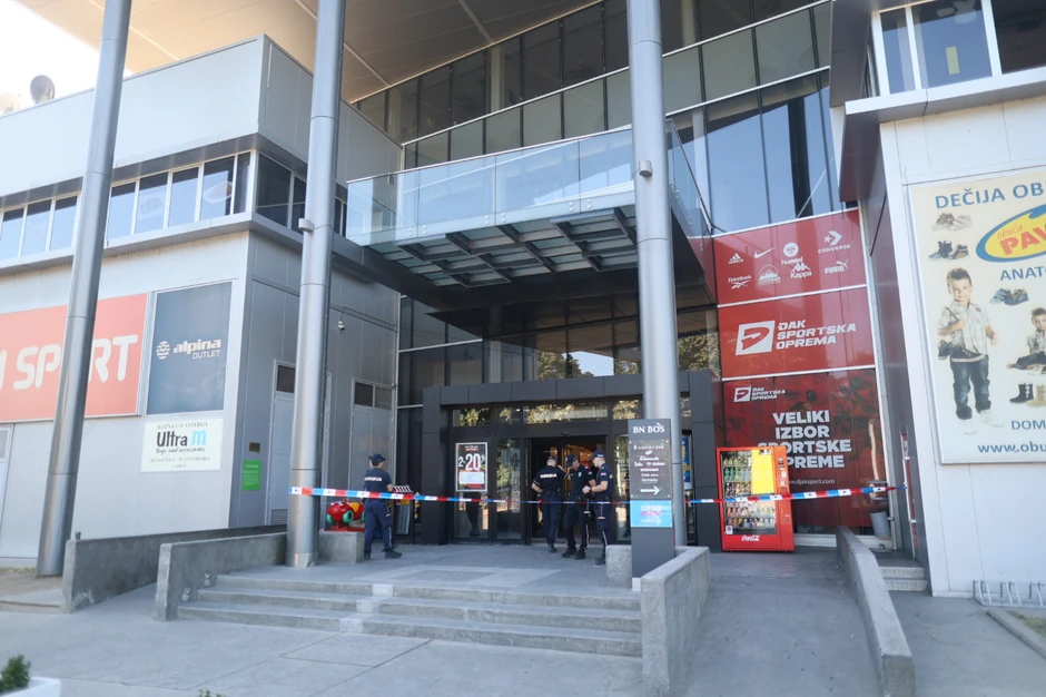 Ulaz u TC BN Bos na Galenici obeležen je policijakom trakom, a ispred su policijske patrole koje obezbeđuju objekat, nakon što se urušio plafon.
