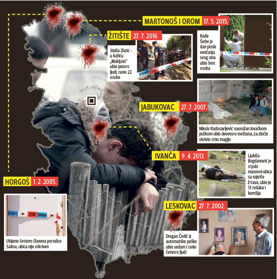 Žitište, Velika Ivanča, Martonoš, Jabukovac, Horgoš, Leskovac - šest mesta u kojima je ubijeno 46 ljudi u masovnim zločinima, koji su u poslednjih 15 godina potresli Srbiju.