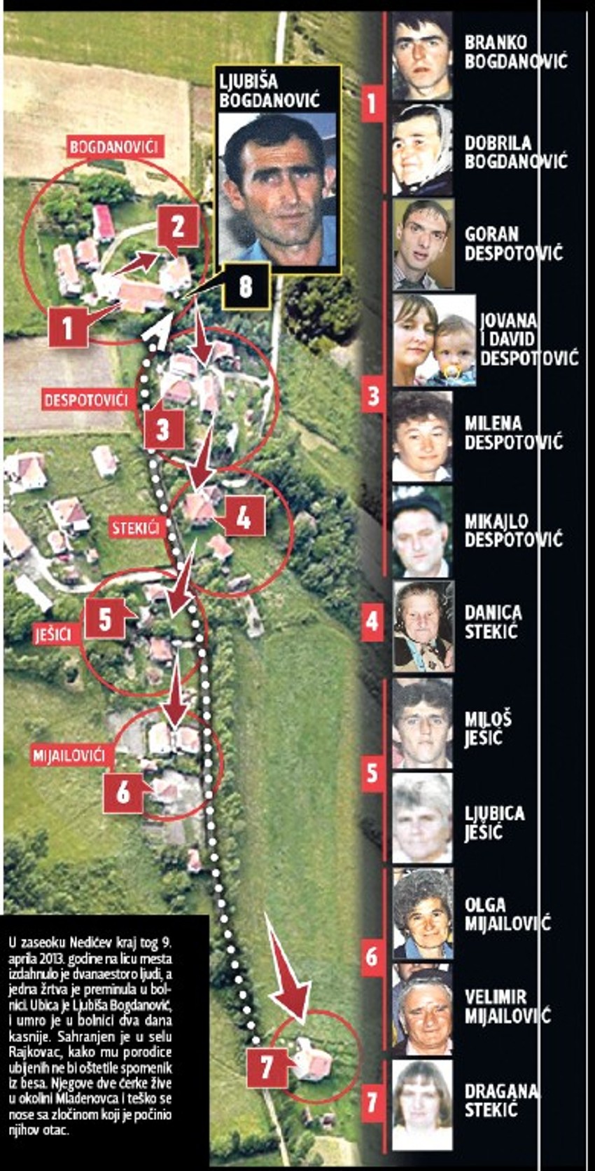 Podsećanja radi, krvavi pir dogodio se 9. aprila oko pet ujutru. Ljubiša je prvo u svojoj kući ubio majku Dobrilu i sina Branka. Potom je provalio u susednu kuću porodice Despotović, gde je pobio svih pet članova, uključujući dvogodišnjeg Davida. Zatim je ubio po dvoje članova porodica Jelašić, Mijailović i Stekić. Lančano ubistvo, koje je trajalo oko pola sata, završilo je dolaskom policije i pokušajem počinioca da izvrši samoubistvo hicem u glavu.