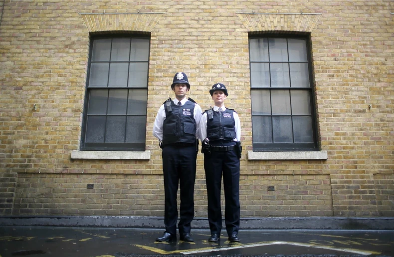 Pozornici Ben Sinkler i Karen Spenser poziraju ispred sedišta policije u Londonu
