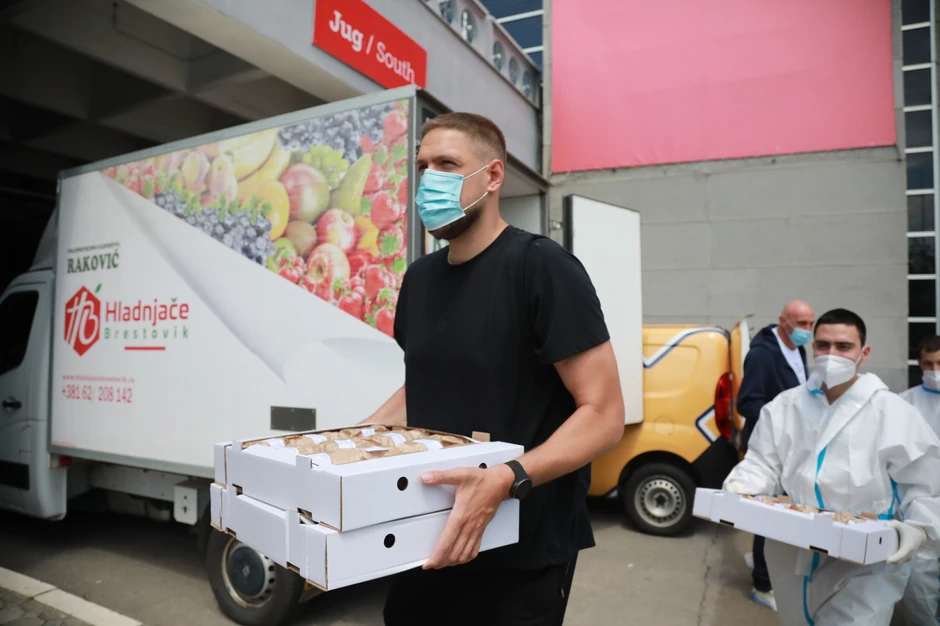 U saradnji s Ministarsvom zdravlja danas je u Beogradsku Arenu za svakog zaposlenog dostavljen ketering i više od tone vitaminskih paketa od svežeg voća i prirodnih sokova. Pomoć i podršku za heroje koji danonoćno zbrinjavaju obolele od virusa korona u ovoj ustanovi pružio je i Vladimir Štimac, as KK Crvena zvezda i reprezentativni osvajač medalja, državni sekretar iz Ministarstva zdravlja Aleksandar Stefovski i direktor Beogradske arene Goran Grbović.