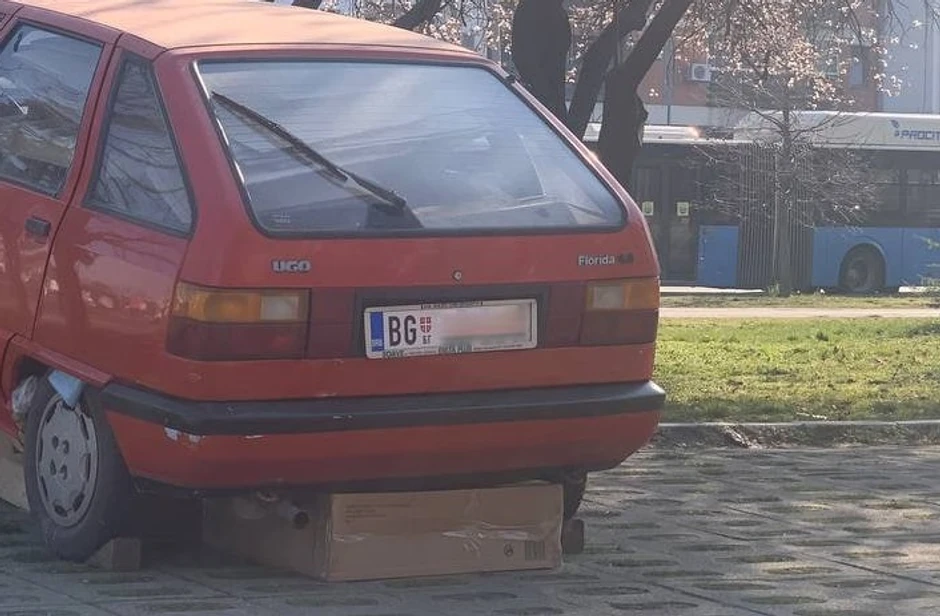 Naime, na parkingu se našao automobil sa beogradskim registarskim oznakama podignut na par dasaka, cigala i kartonskih kutija i bez dva prednja točka, prenosi nsuzivo.