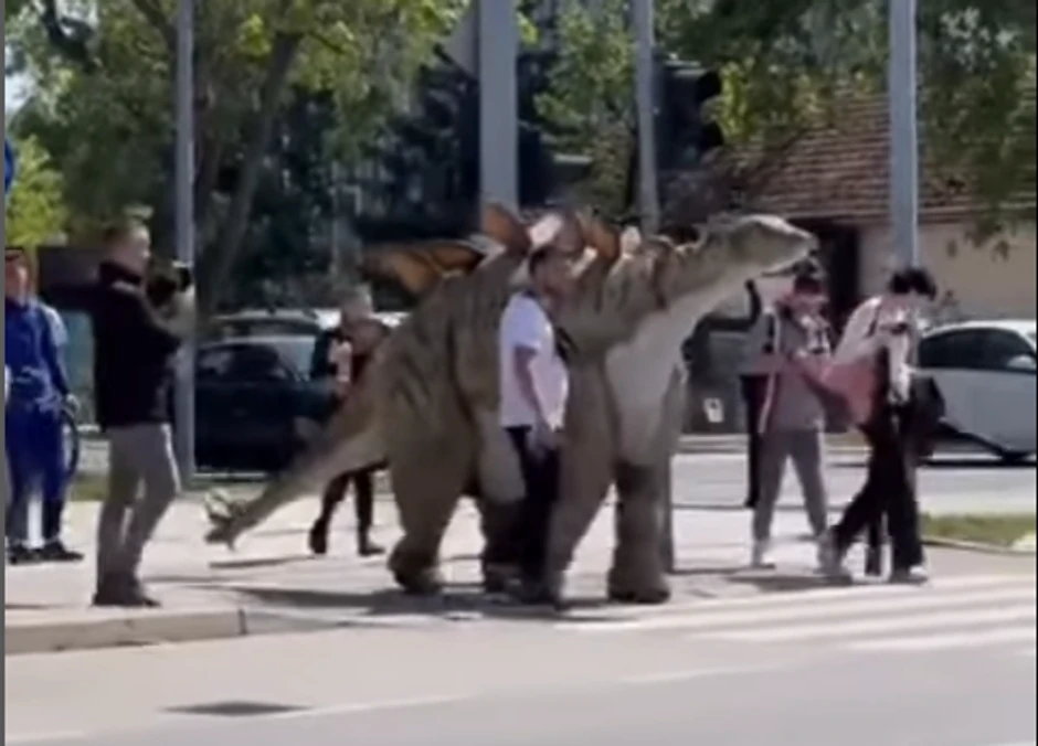 Reč je, ni manje ni više o dinosaurusu! Nesumnjivo prava atrakcija u vidu velikog kostima dinosaurusa u pratnji jednog čoveka je prelazila ulicu na Bulevaru Evrope u Novom Sadu.