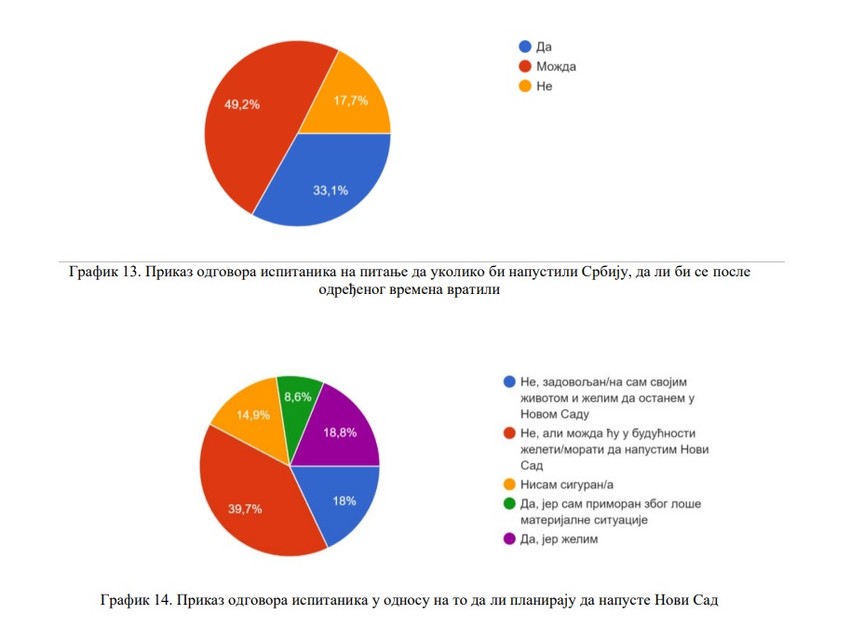 Na pitanje da li bi napustili zemlju, 18 odsto ispitanika kaže da nemaju tu nameru, dok čak 37,9 odsto njih kažu da ne žele, ali nisu sigurni da li će morati u budućnosti. Takođe, 14,9 odsto anketiranih daju odgovor da nisu sigurni da li bi to učinili, pokazuje istraživanje.