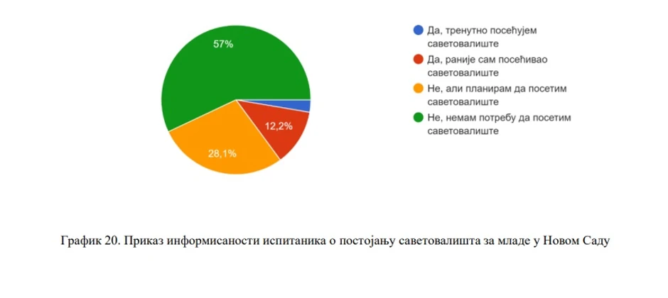 O tome da u Novom Sadu postoje besplatna psihološka savetovališta za mlade sa programima unapređenja mentalnog zdravlja, zna i posećuje samo 2,7 odsto mladih. Čak 57 odsto ne zna da postoje i nema potrebu da ih poseti.