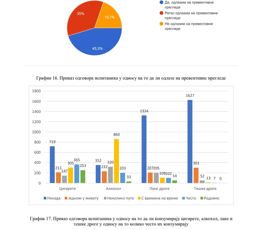 Blizu polovine anketiranih mladih Novosađana odlazi na preventivne zdravstvene preglede, čak 45,3 odsto njih, preko trećine retko odlazi (35 odsto), dok blizu četvrtine ne odlazi na preventivne preglede (19,7 odsto).