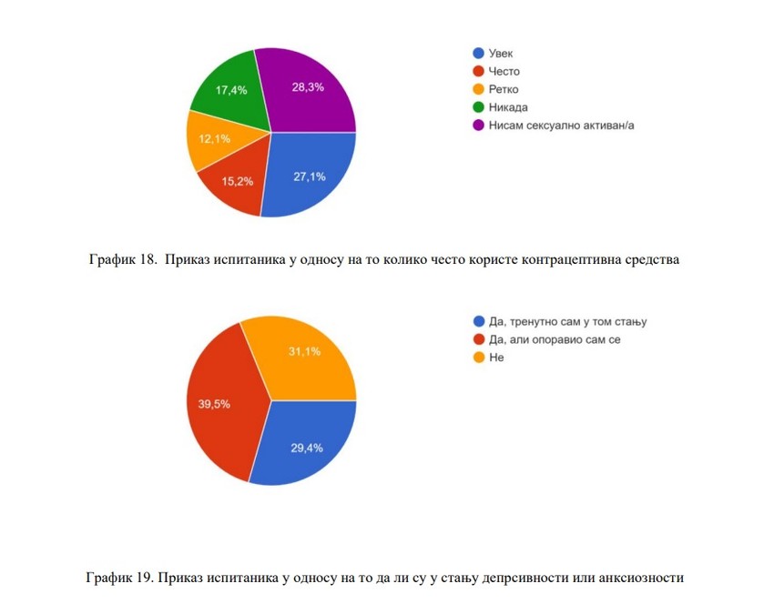 Skoro trećina ispitanika, odnosno 28,3 odsto nije seksualno aktivna, preko četvrtine ispitanika (27,1 odsto) uvek koristi kontraceptivna sredstva prilikom seksualnih odnosa, 17,4 odsto njih nikada ne koristi kontraceptivna sredstva, retko koristi 12,1 odsto ispitanik, a često za tri procenta više.
