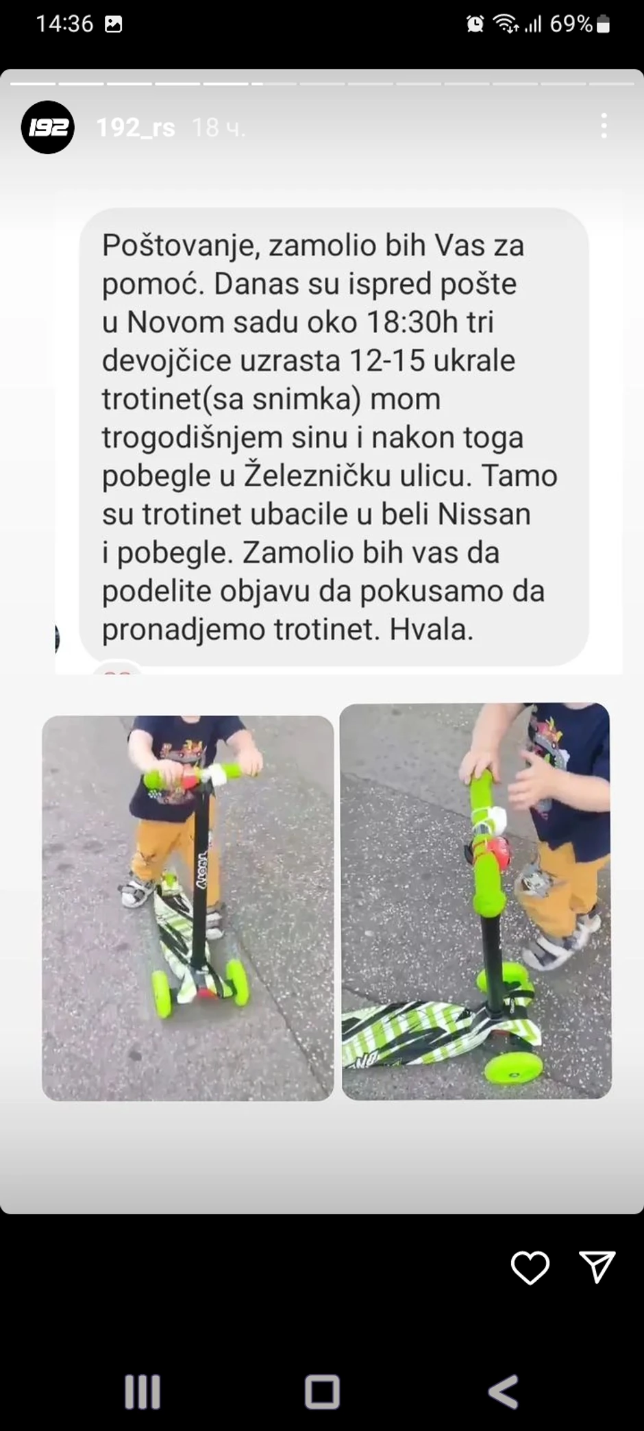 Uz snimak kako trotinet izgleda, otac je objavio da je isti ukraden, te da su to učinile devojčice stare od 12 do 15 godina.