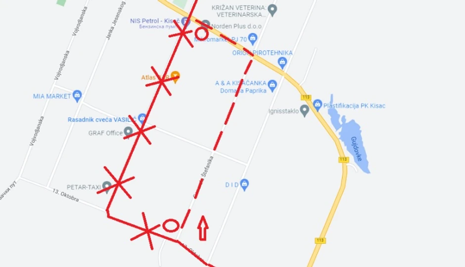 Ulicom 13. oktobra, desno Štefanikovom, levo Slovačkom ulicom do raskrsnice Slovača/Dr Janka Gombara, odakle će nastavljati redovnom trasom.