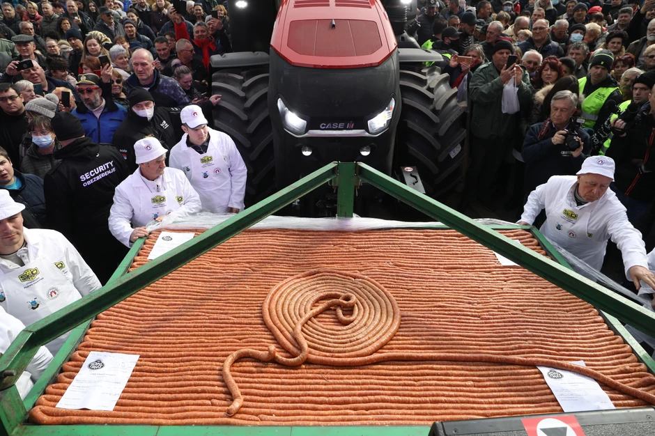 - Današnja kobasica je dugačka 2.038 metara. Nas deset majstora je radilo nedelju, oko 2, 5 tone mesa, odnosno, 25 velikih krmača je zaklano, prerađeno i ubačeno u ovu našu lepu kobasicu. Ukus je takav da mogu da je jedu deca od sedam godina i matori od 77 godina. Znači, pikantna je tako da je svi mogu jesti. Dvadesetak godina učestvujem. Prošle godine nismo mogli da održimo Kobasicijadu zbog korona virusa. Ipak, pošto smo humani, došli smo na ideju da napravimo kobasicu, koja je prošle godine bila 2.037 metara i mi smo je celu podelili u humanitarne svrhe. Dali smo meso školama, gernatološkim centrima, narodnim kuhinjama... Sad je ova za metar, tradicinonalno duža. Prodajemo je za 600 dinara po metru i verujem da će sve da ode za do dva sata. Neko uzme metar, neko pet, ode to ošas posla- rekao je za "Blic" Ranislav Stankov, iz udruženja Kobasicijada Turija.