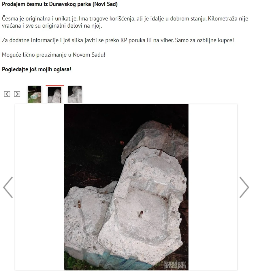 Tako se juče na jednom od posećenijih sajtova za kupovinu i prodaju našao oglas koji potvrđuje prethodno napisano. Naime, reč je o oglasu za prodaju česme iz Dunavskog parka?!