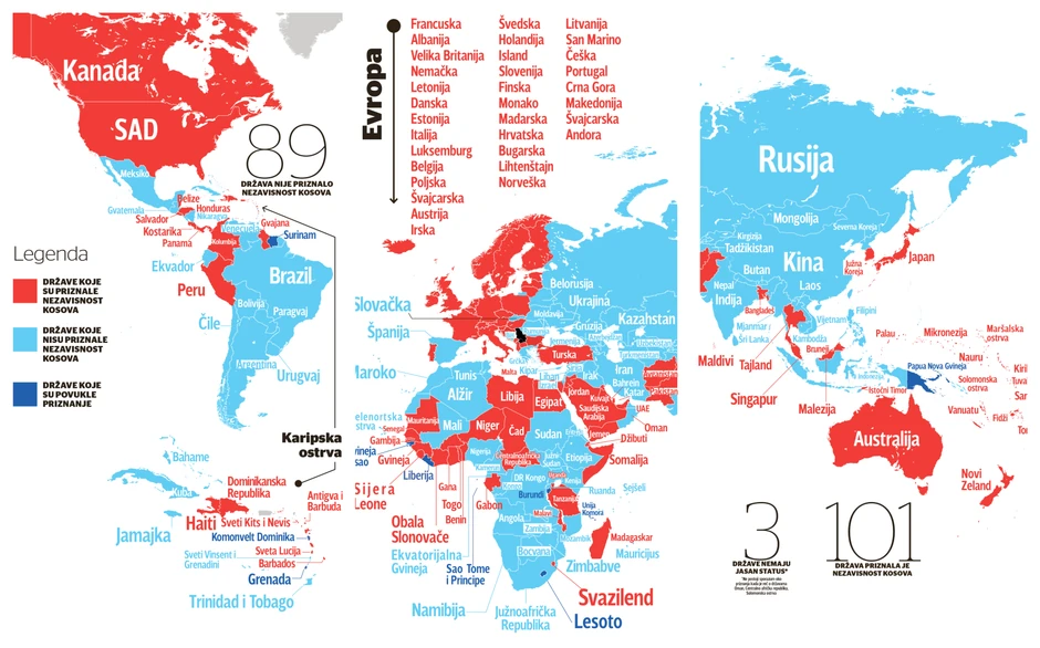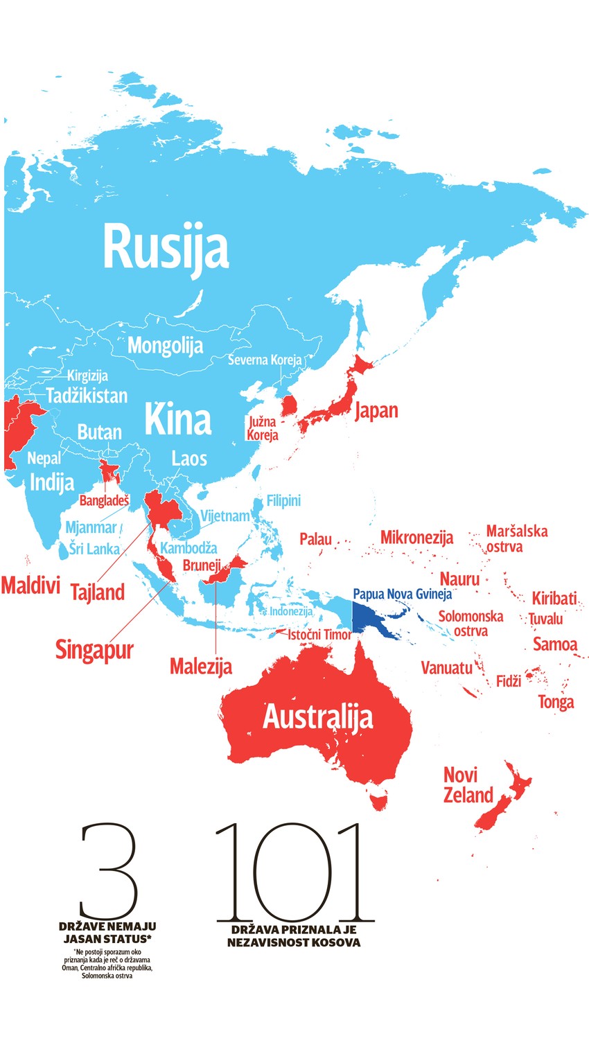 Kada se ova spoljnopolitička utakmica Beograda i Prištine prenese na kartu sveta jasno je i da se ovo nadmetanje pretvorilo u borbu Istoka i Zapada. Gotovo sve velike zapadne sile na čelu sa SAD priznale su nezavisnost Kosova, dok podrška Srbiji stiže uglavnom sa istoka, pre svega od Rusije i Kine.