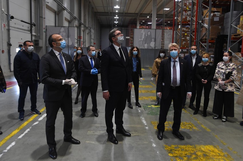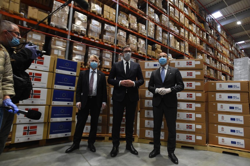 Predsednik Srbije Aleksandar Vučić, ambasador Kraljevine Norveške Jern Eugene Jelstad i šef Delegacije EU u Srbiji ambasador Sem Fabrici sastali su se danas, kako bi obavili primopredaju medicinske opreme neophodne za borbu protiv zarazne bolesti KOVID-19, koju Norveška i EU doniraju Srbiji.