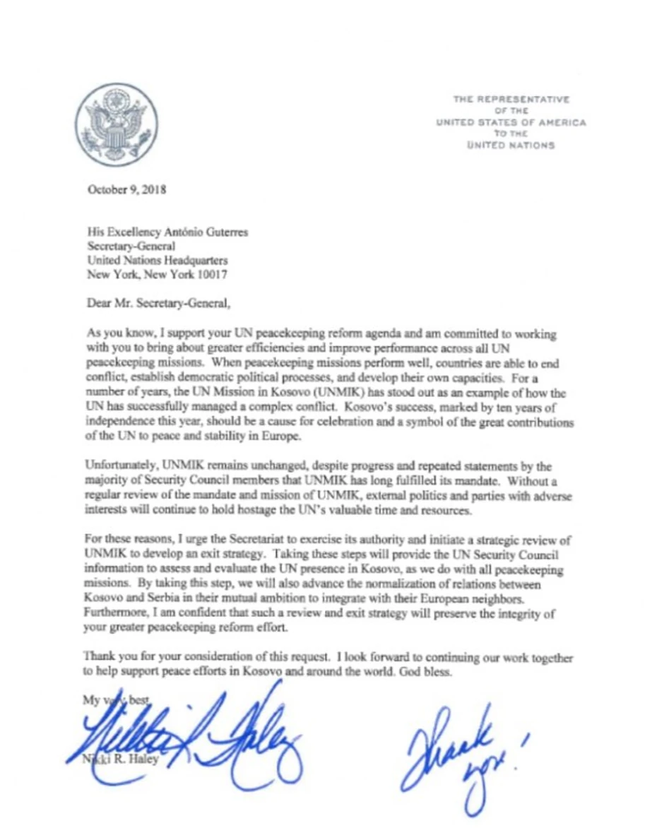 Istog dana kada je objavila da se povlači s mesta ambasadora SAD u Ujedinjenim nacijama (UN), Niki Hejli je poslala pismo generalnom sekretaru UN u kom traži da se UNMIK povuče s Kosova i Metohije.