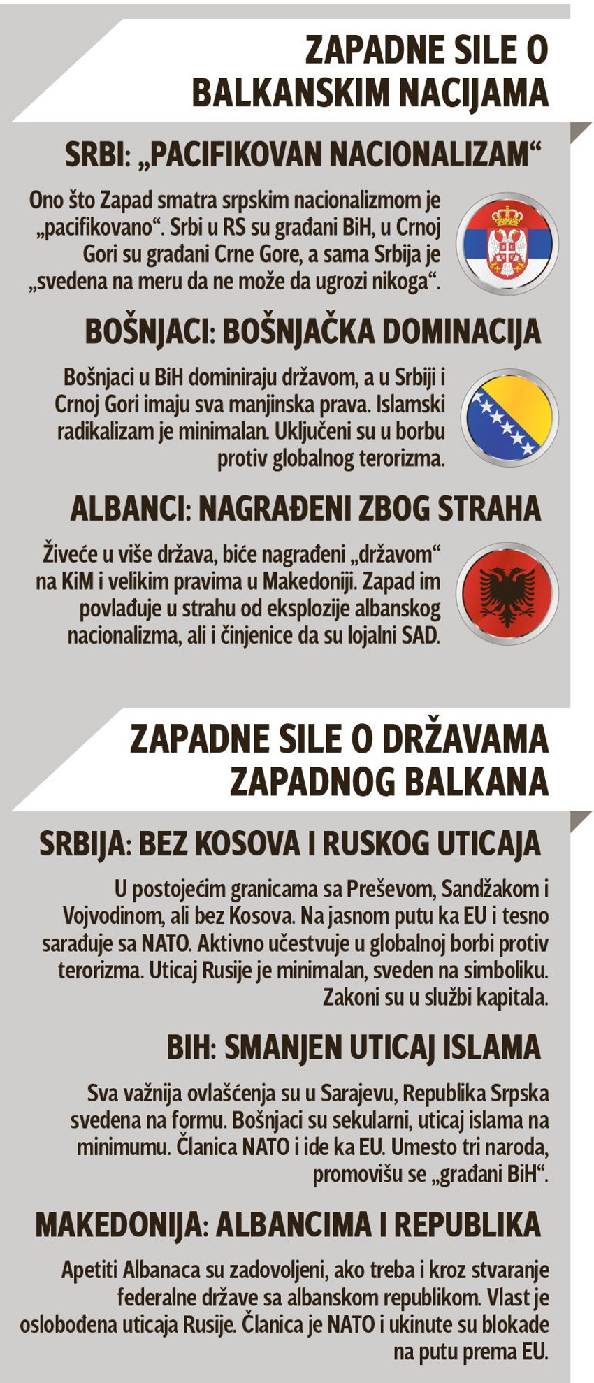 Za sve zemlje zapadnog Balkana to podrazumeva približavanje i, naposletku, ulazak u EU, sa razvijenom vladavinom prava i tržišnom ekonomijom. Ali i forsiranje procesa sa kojima će se Srbija teže pomiriti, kao što su, kako to zapadne sile vide, „pacifikacija srpskog nacionalizma“, ulazak u NATO, ukidanje Republike Srpske i „zadovoljni Albanci“ u svim državama u kojima žive.
